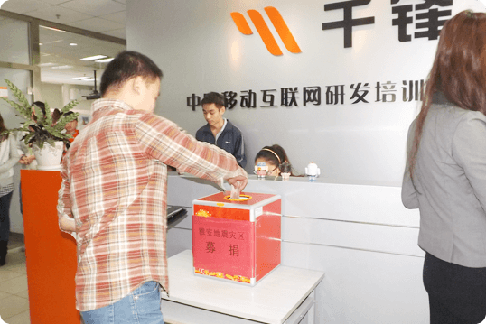 千鋒教育發(fā)起“雅安,你要平安-為雅安地震災(zāi)區(qū)捐款”的倡議,號(hào)召全體員工及學(xué)員捐款,通過深圳壹基金公益基金會(huì)捐助給災(zāi)區(qū)。